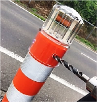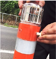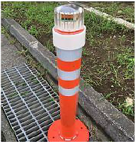 従来使用されていた発光誘導灯は、ラバーポールの先端に取り付ける場合、ポールの先端をくり抜いて接着剤や